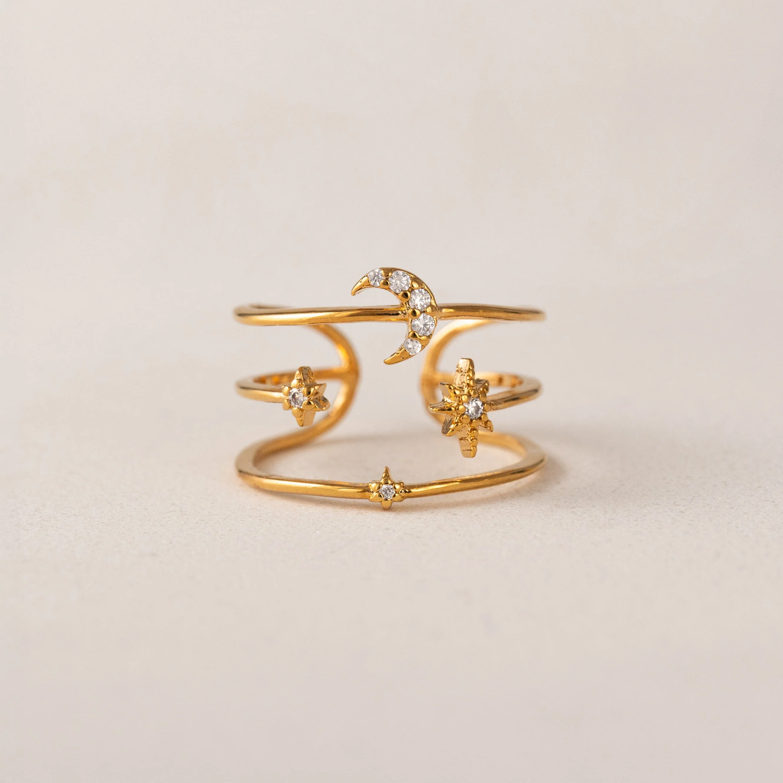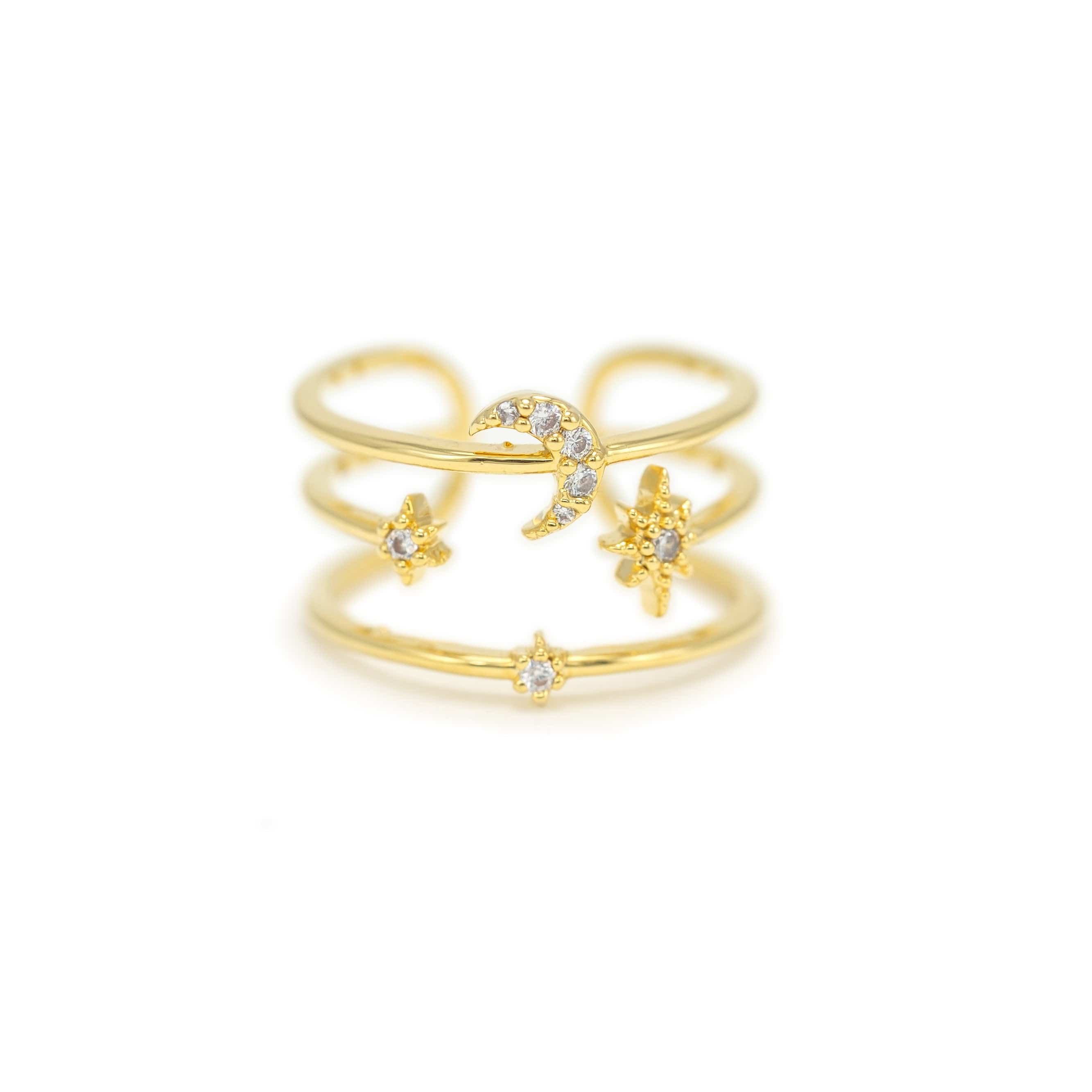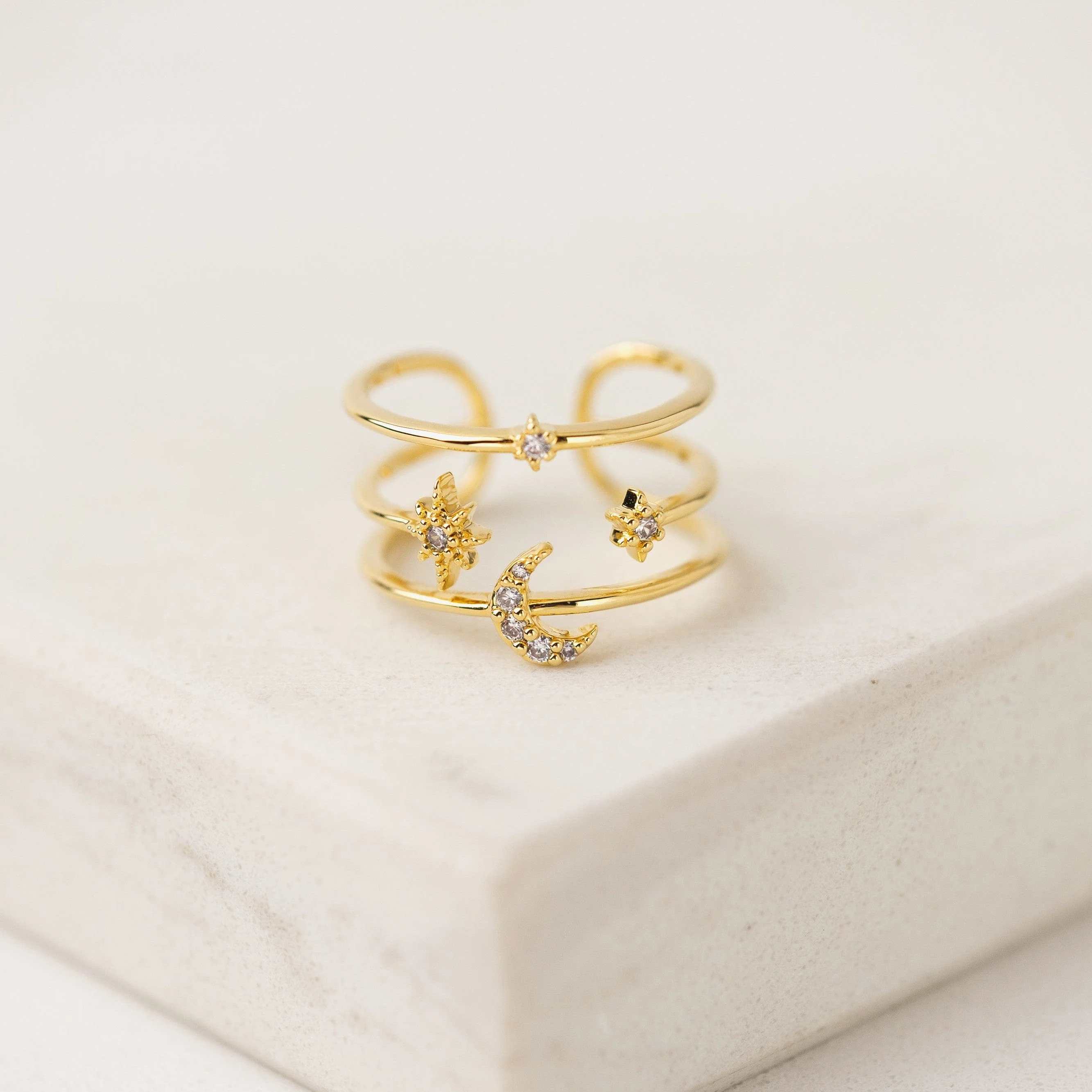 A good luck charm with triple the power. Crystal celestial motifs adorn the delicate gold bands, making this ring equal parts covetable and cosmic.