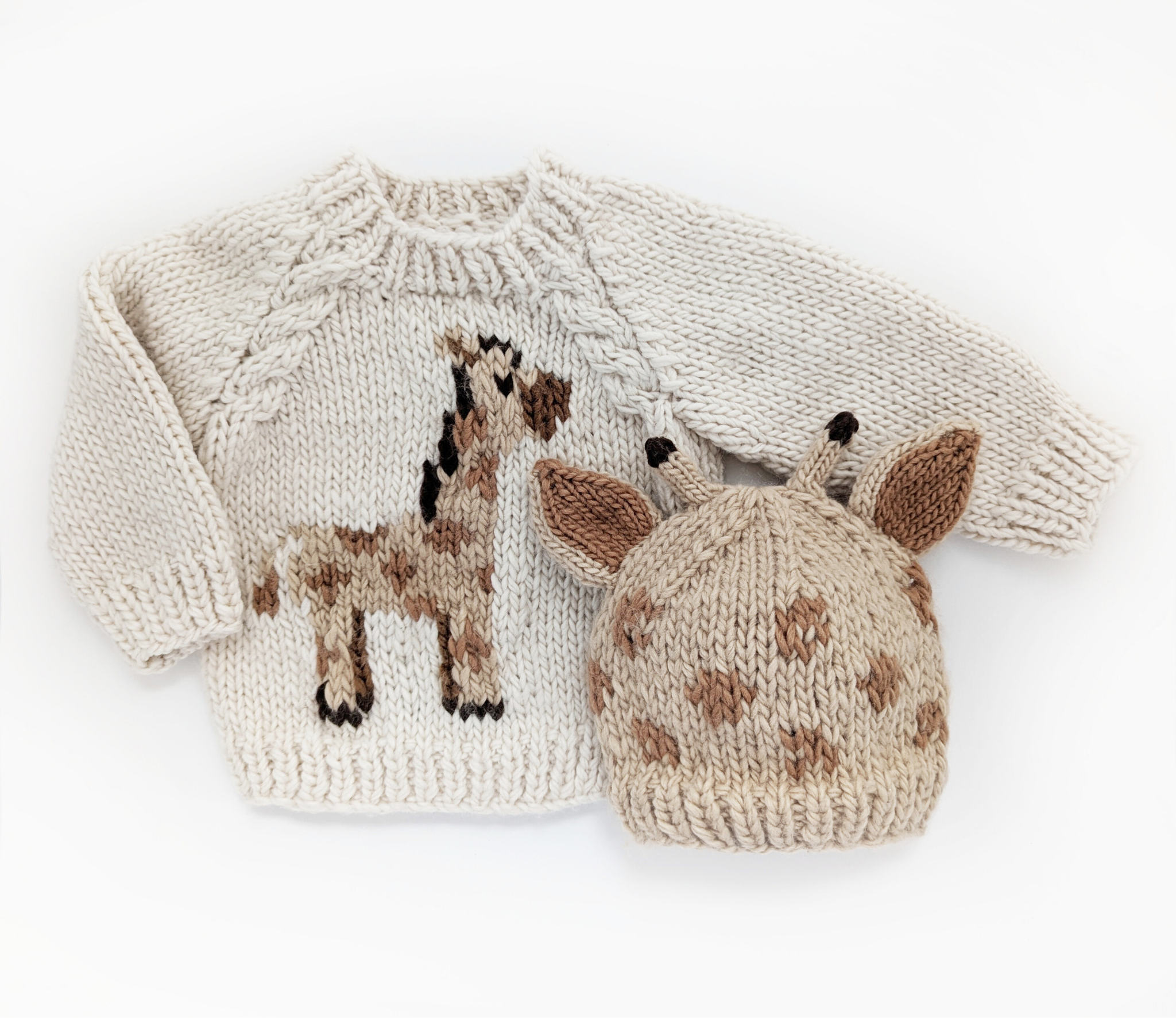 Keep your little one snuggled up in style with this cozy, hand-knit Giraffe Sweater and hat set. Not only will it make them look absolutely adorable, but the raglan sleeves and cable details make for a unique and fun twist. The coordinating Giraffe Beanie Hat tops it off! Both are partially knit from recycled, sustainable Polyester yarn made from plastic bottles.