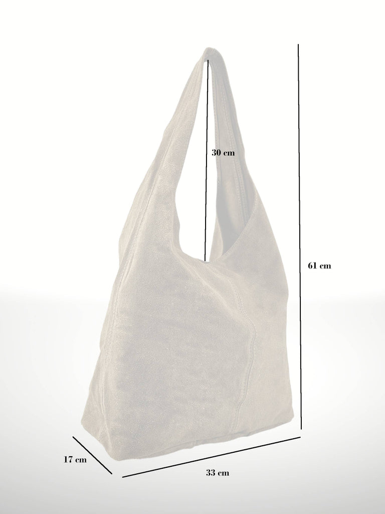Exterior: Genuine suede leather, soft to the touch and resistant, with a refined finish. Interior: Large compartment without pockets, offering greater capacity and simplicity. Additional details: Top zip closure for added security and convenience.