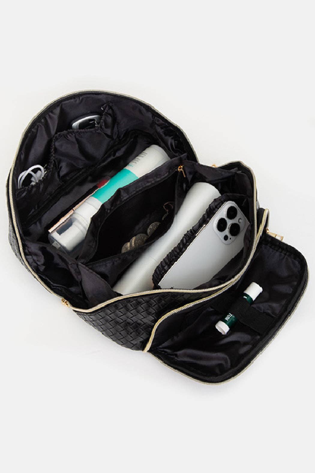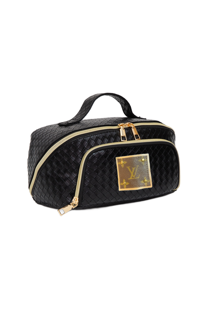 This one-of-a-kind pouch is made from vegan leather and upcycled materials, specifically authentic Louis Vuitton details. The LV detail is sewn on leather, adhered and riveted, featuring a zipper closure and multiple pockets for keeping things organized. Although it's compact, it's not just for makeup. 10" X 5" X 4.5".