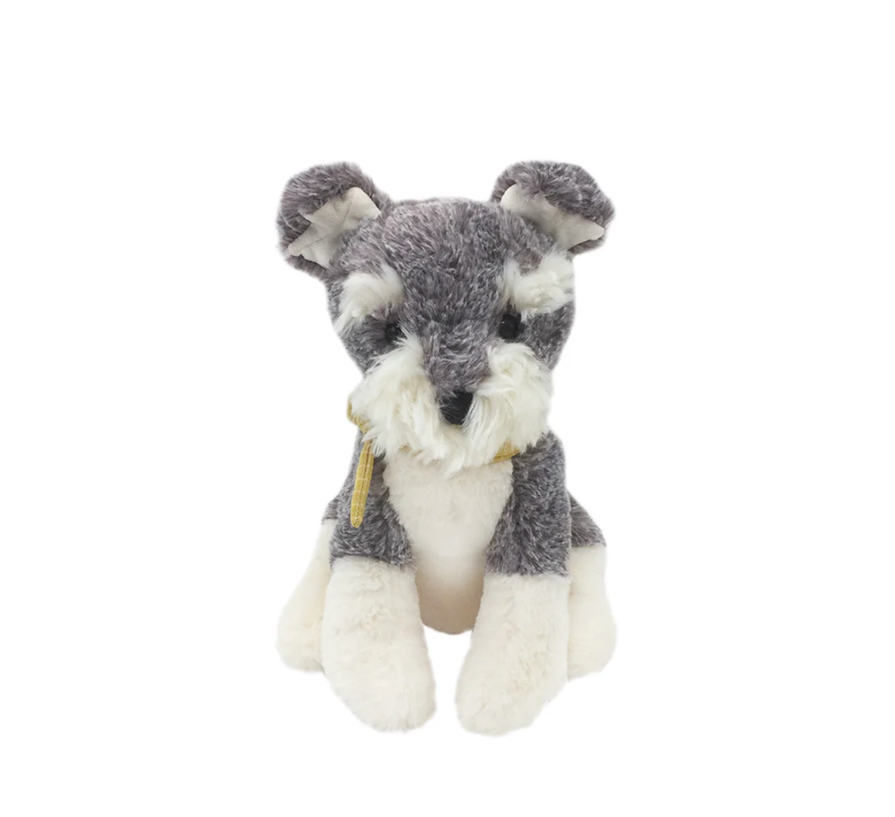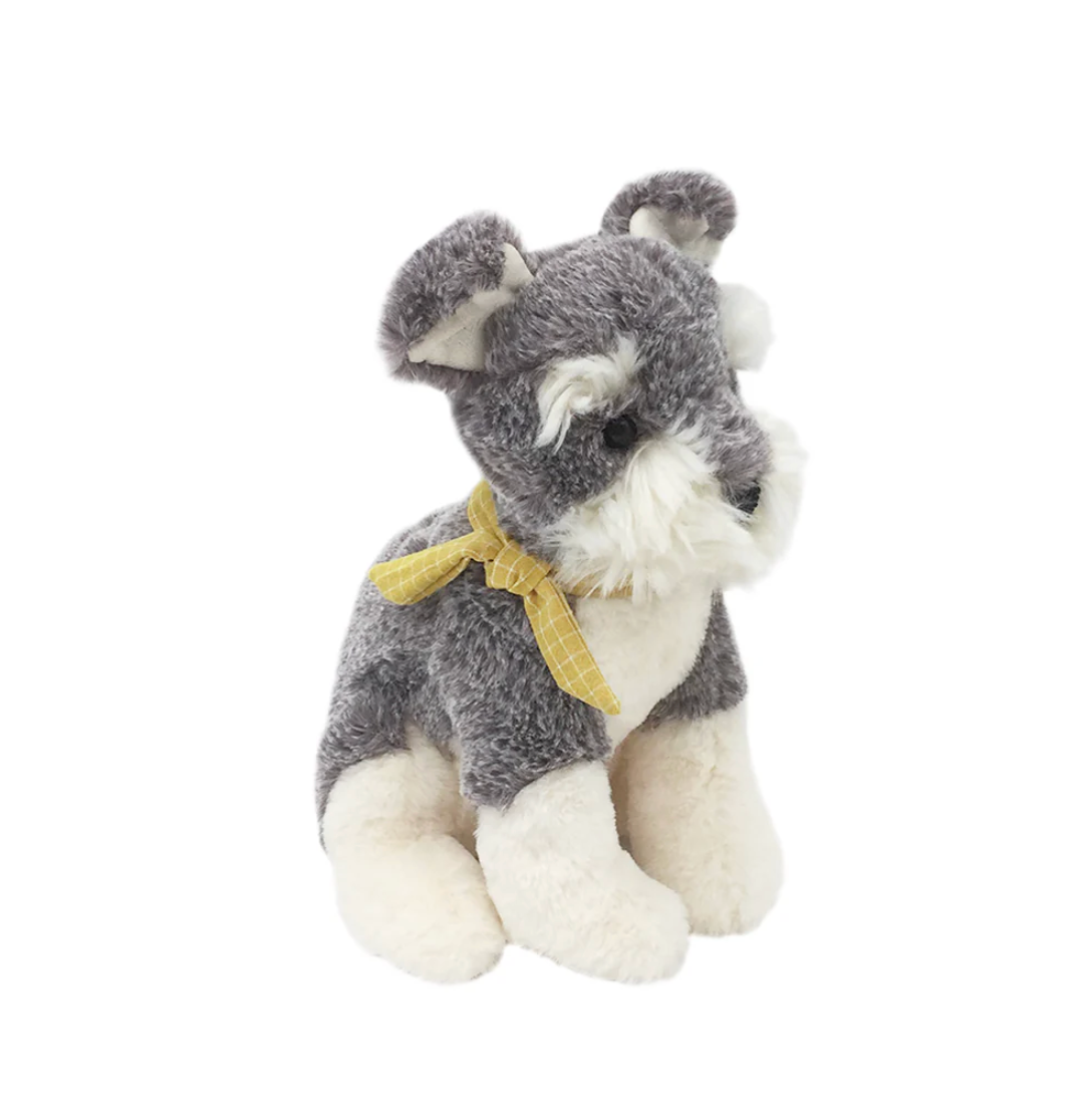 Meet Winston the Shnauzer! Gray and Ivory fur, with a mustard color scarf, he is simply adorable. He is sure to put a smile on anyones face!