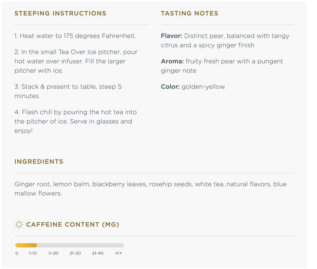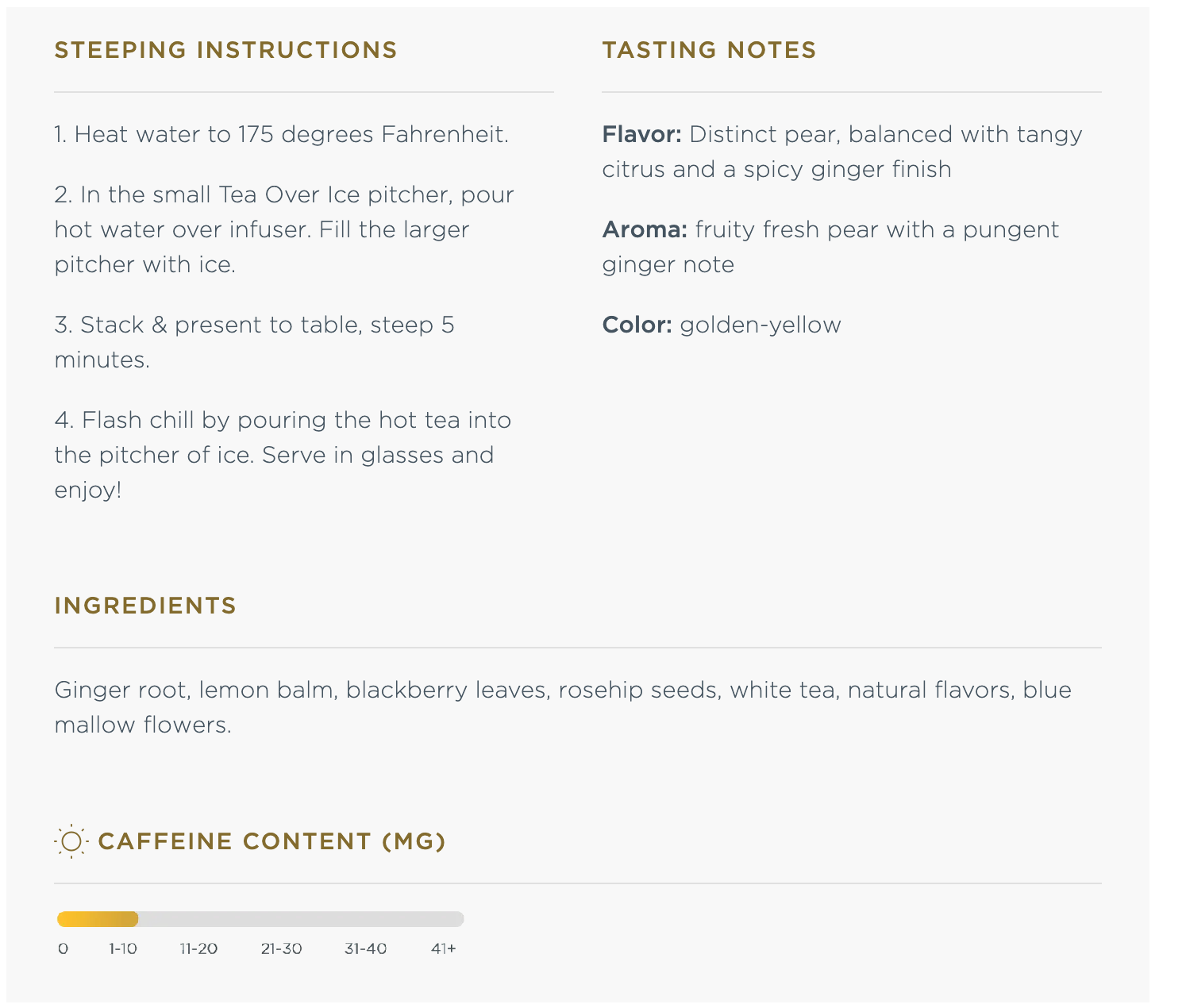 Ginger root, lemon balm, blackberry leaves, rosehip seeds, white tea, natural flavors, blue mallow flowers.