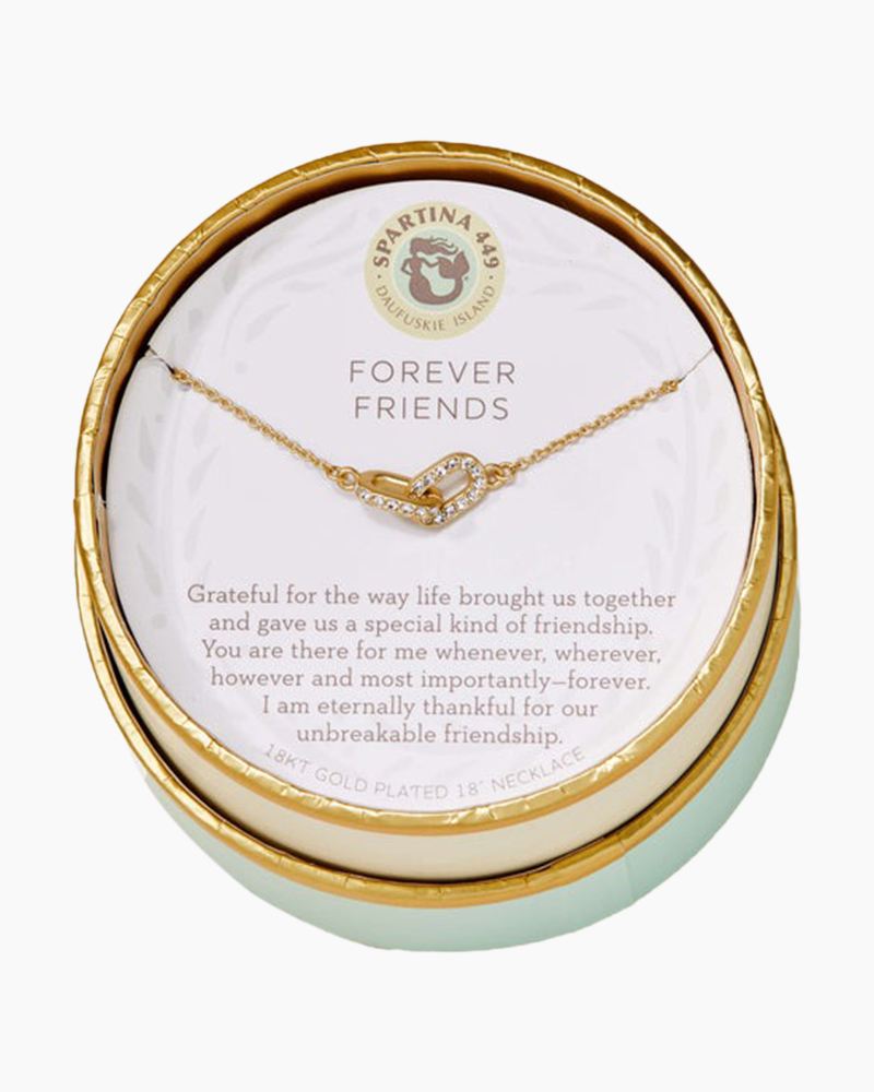 Wear the Forever Friends Necklace as a reminder of unbreakable friendship. Featuring a glass crystal studded link charm, this special piece comes packaged inside a beautiful box with the message: "Grateful for the way life brought us together and gave us a special kind of friendship. You are there for me whenever, wherever, however and most importantly - forever. I am eternally thankful for our unbreakable friendship."