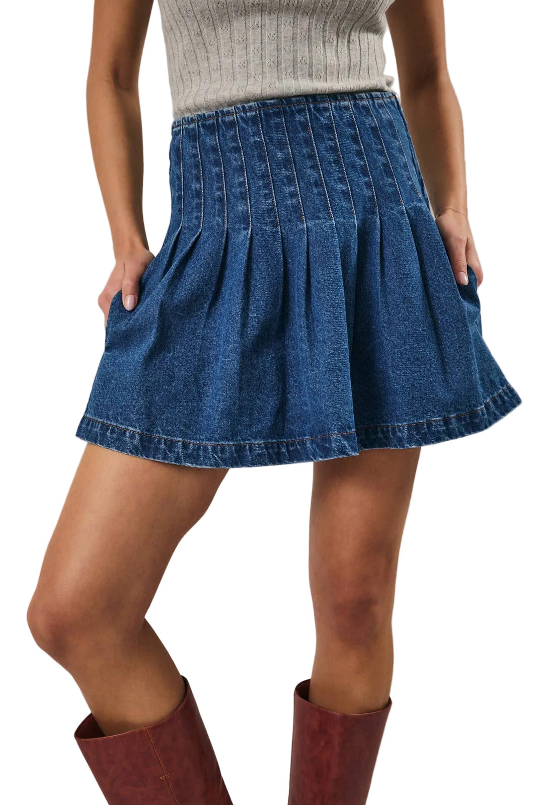 Meet your new weekend uniform. This pleated denim mini skirt brings vintage charm with a modern edge—those crisp pleats create flattering movement while the timeless denim keeps it endlessly versatile. Dress it up with heels and a silky top, or keep it casual with sneakers and a graphic tee. Whether you're brunching, exploring the city, or just living your best life, this skirt is your go-to for effortless style that actually feels fun to wear.
