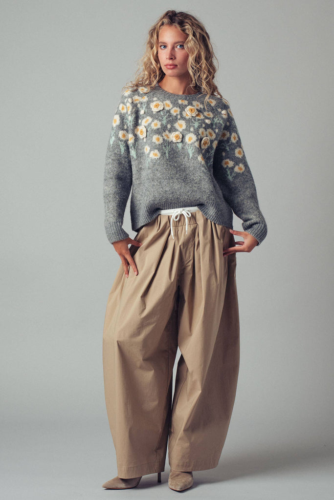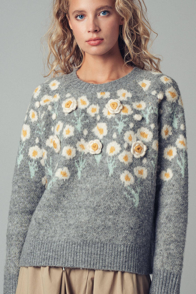 Bring soft charm to chilly days with this daisy-embroidered knit sweater featuring delicate 3D floral detailing and pastel accents. Cozy, stretchy, and layer-friendly—it's a perfect touch of whimsy for your fall-to-winter wardrobe.