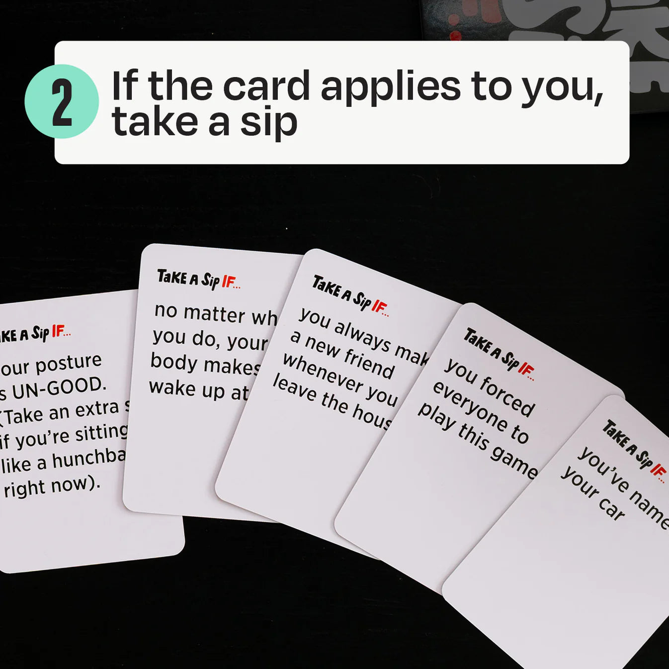 - TAKE A SIP IF… is a party game meant for a fun night in (or out)! Learn more about your friend group while swapping stories, poking fun at one another, and of course, uncontrollably laughing. These relatable cards make for a great icebreaker game or getting even closer with your besties.