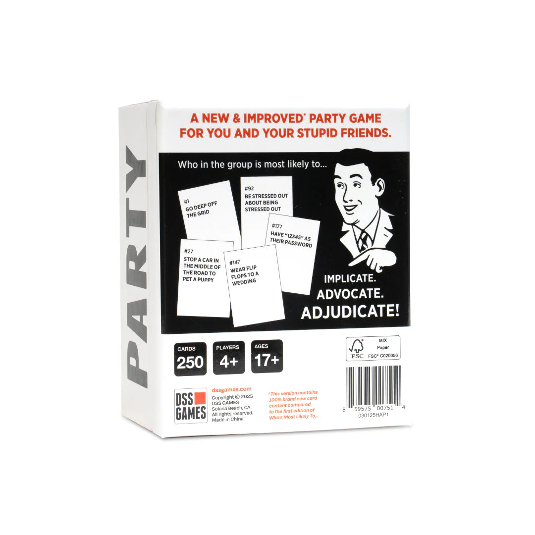 - Who’s Most Likely To… is back with 100% brand NEW card content. It’s the same party game for you and your stupid friends with 250 new cards to roast them with. Great for game night, girls night, parties, big friend groups, gifts, teens, and adults.